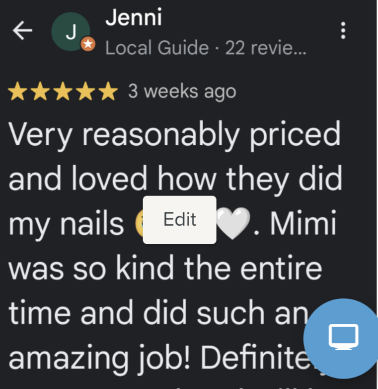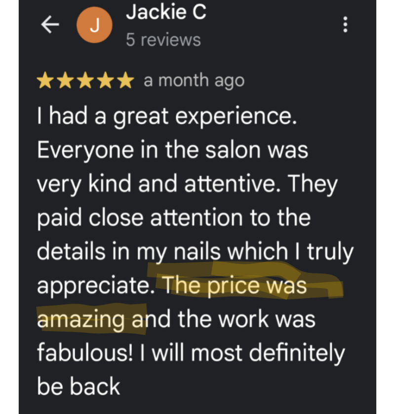 πππPrices are subject to CHANGES, without Prior Notices. π π π As most customers want to have their Nails done in a certain way, please Text or Call for a free, personal Consultation, and a PRICE QUOTE πππFactors such as SHAPE, Take Off/ Soak Off, Finishing Coats-Ombre- Cat Eye- Builder Gel- Russian Manicure ... would influence PRICINGπ π π From Customers' COMMENTS, our PRICES are very PLEASING,π very AFFORDABLE, πvery COMPARABLE. π What about DISCOUNTS? π€π€π€Our Discounts are AUTOMATICALLY given to Customers in the Extra CARE,π the Extra ATTENTION,π the Extra TIME, πthe Immense RESPECT to the Customers' WISHES ... during our Services. πππ The Award of BEST OF 2024 is a reflection of our Extraordinary Services at an Affordable price.
