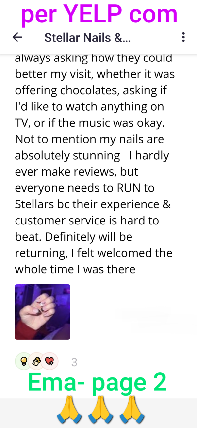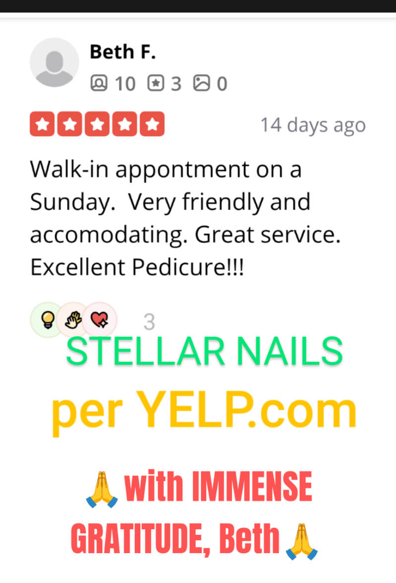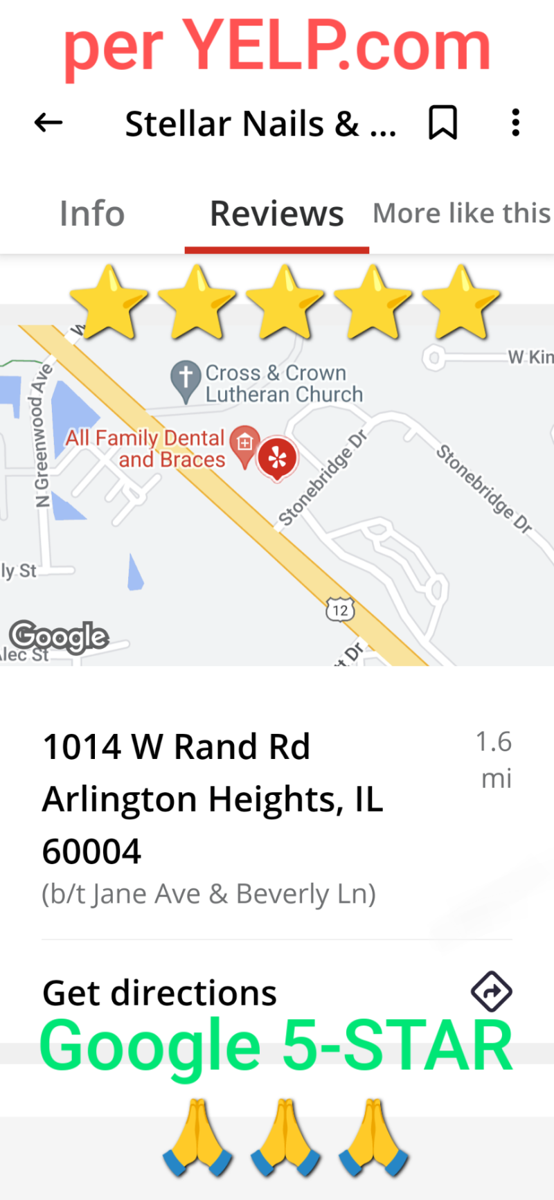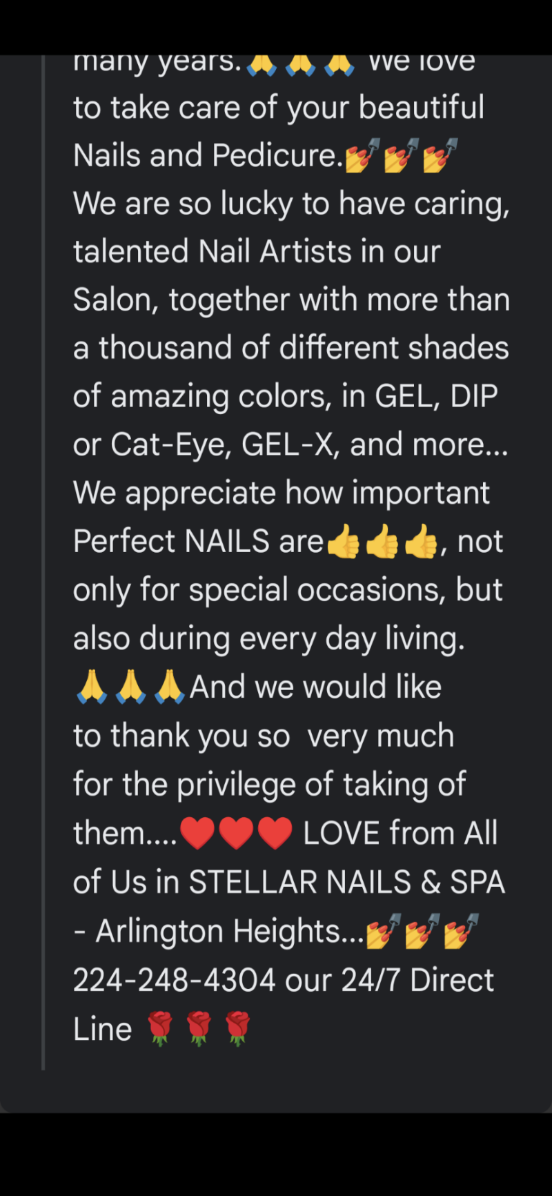 πππWe are so grateful for all the Time and Effort our Beloved Customers have taken to post their Feedbacks in Google Maps. πππ... As of 26th November 2023, during the last many months of Caring for your Nails: the MANICURE π π π , your BeautyπΉπΉπΉ... the PEDICURE π£, your Health ππππΊπΊπΊ... we have received from you PERFECT 5-STARS.πππππ ... Thank You, all of YOU, so very muchπππ .... Lots of LOVE β€οΈβ€οΈβ€οΈfrom all of us in STELLAR Nails & Spa - Arlington Hts, IL 60004...πππ ... Please call or text us at our 24/7 Dedicated iPhone 224-248-4204βοΈβοΈβοΈπ±π±π±πππ